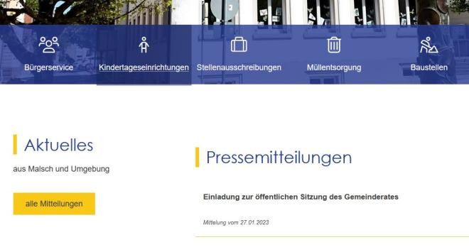 Darunter befindet sich ein Bereich mit aktuellen Themen und Pressemitteilungen der Gemeinde Malsch.