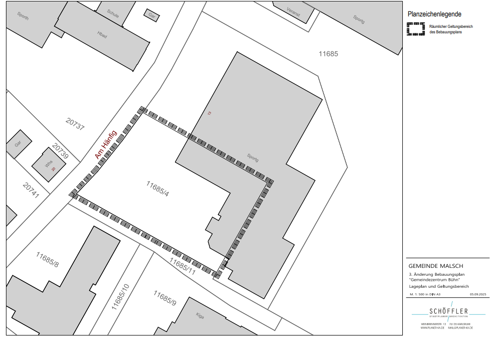 Der Gemeinderat der Gemeinde Malsch hat in seiner öffentlichen Sitzung am 30.09.2025 gemäß § 2 Abs. 1 BauGB, den Aufstellungsbeschluss für die 3. Änderung des Bebauungsplans „Gemeindezentrum-Bühn“ gefasst.