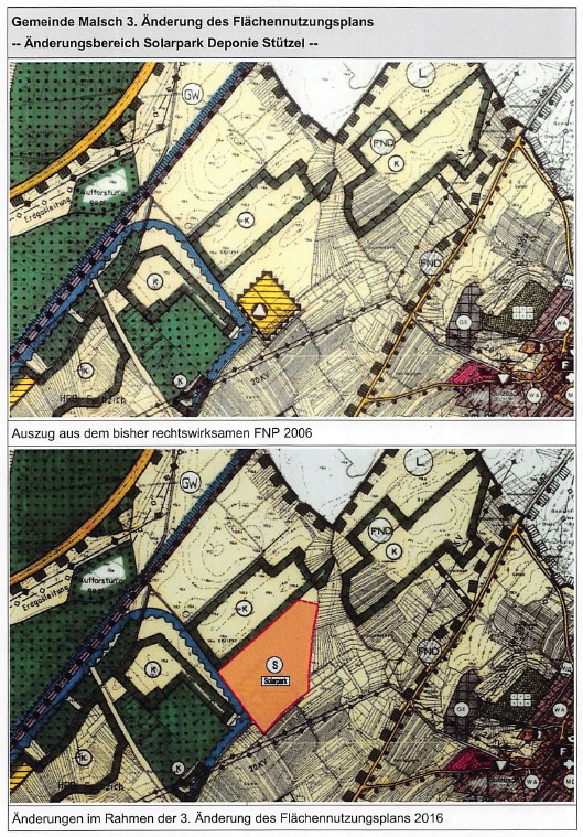 Da PV-Anlagen im planungsrechtlichen Außenbereich grundsätzlich nicht als privilegierte bauliche Anlagen zulässig sind, erfolgt parallel zur Aufstellung des Bebauungsplans die 5. Änderung des Flächennutzungsplans der Gemeinde Malsch. So gilt der Bebauungsplan aus dem Flächennutzungsplan entwickelt.