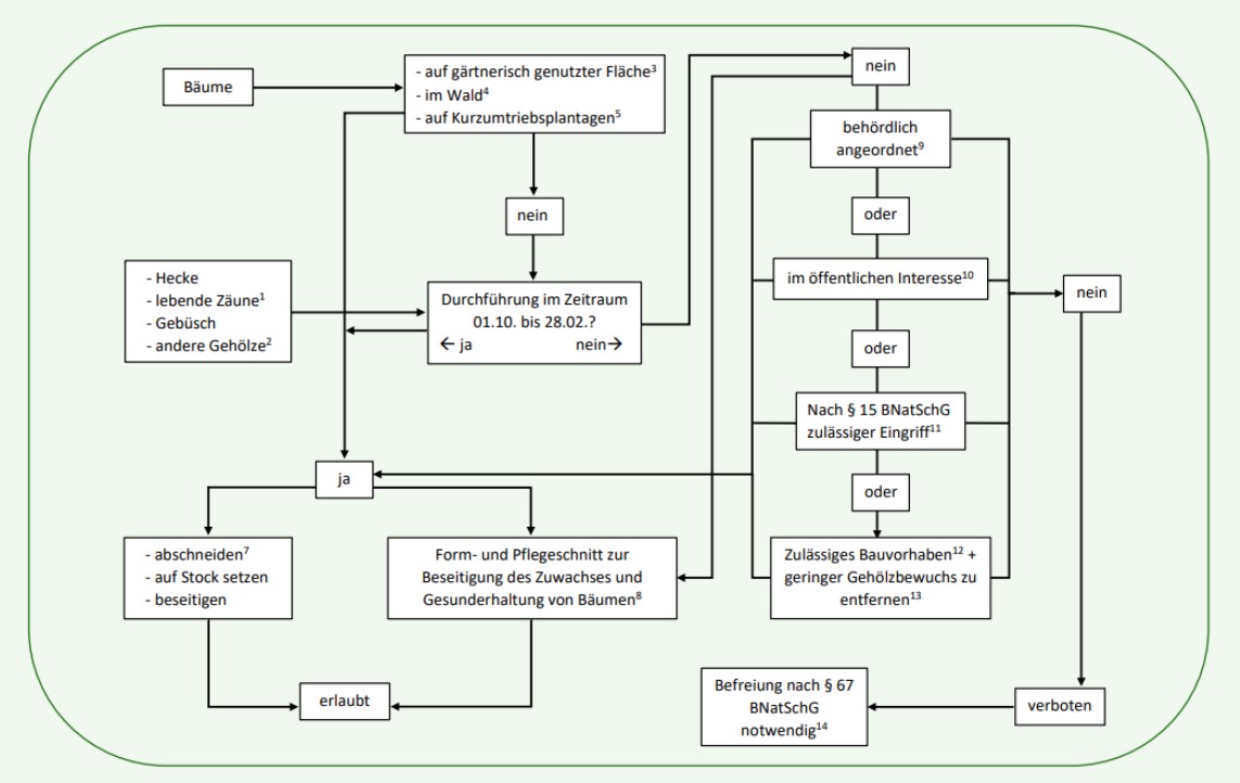 Sie möchten einen Baum, eine Hecke oder anderes Gehölz entfernen? Die gesetzliche Grundlage hierfür findet sich im § 39 Abs. 5 BNatSchG. Dieser regelt, welche Art von Pflanze zu welchen Zeiten und unter welchen Voraussetzungen und Bedingungen geschnitten, gefällt oder sogar komplett entfernt werden darf. Die abgebildete Übersicht hilft Ihnen dabei, jeden Einzelfall Schritt für Schritt eigenständig zu prüfen. Unabhängig der einzelfallbezogenen Fallkonstellation müssen Sie auch bei erlaubten Vorhaben immer den besonderen Artenschutz nach § 44 BNatSchG beachten.