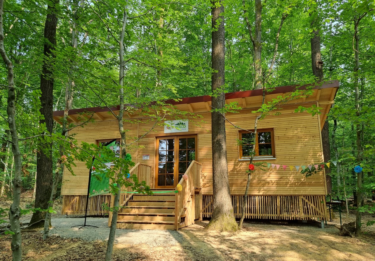 Im Kindergarten ohne Wände hält sich die Gruppe meist im Wald auf. Für extreme Witterungsbedingungen, die einen Aufenthalt im Freien nicht möglich machen, steht eine beheizbare Schutzunterkunft zur Verfügung.