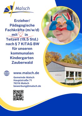 Für unsere liebevoll geführte kommunale Kindertagestätte St. Martin in Malsch suchen wir ab sofort oder zum nächstmöglichen Zeitpunkt eine Pädagogische Fachkraft / Erzieher (m/w/d) in Vollzeit zur Verstärkung unseres Teams.