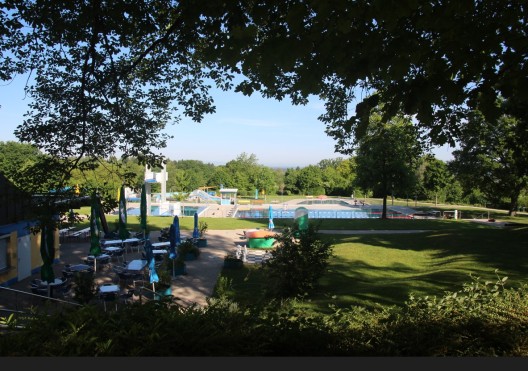 Neben einem Nichtschwimmerbecken mit Breitwellenrutsche und Wasserpilz, einem separat gelegenen Kinderplanschbecken mit Wasserigel, Wasserkanone, Babyrutsche und Wasserspiel, einem Schwimmerbecken und einem Becken mit Sprunganlage verfügt das Bad für die Gestaltung der Zeiten außerhalb des Wassers über einen Kinderspielplatz, ein Beach-Volleyballfeld, Tischtennisplatten und ein Schachfeld an. Für die Versorgung der Besucher mit Getränken und kleinen Speisen gibt es einen Kiosk mit Sitzgelegenheit.